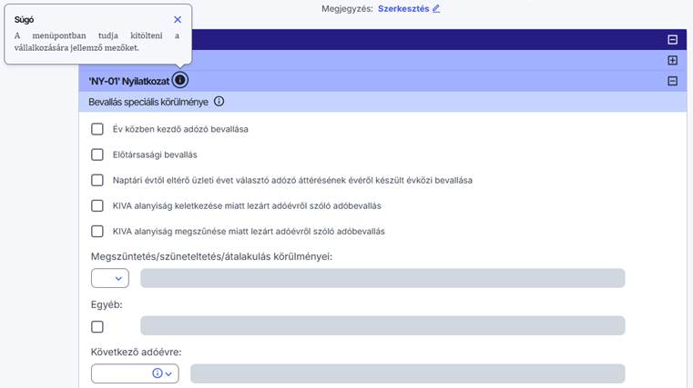 A + jelre kattintva az adott menüpont kinyílik, és láthatóvá válnak az alatta lévő, hozzá kapcsolódó mezők (pontok), amelyek az ONYA-ban mezőcsoportokra tagozódnak. (Lásd az 1. ábrán a Bevallás speciális körülménye mezőcsoportot.)