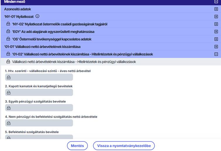 A nyilatkozati menüpont kitöltése után megjelenik a lakat jelölés. Lakat védi a kitöltő számára letiltott menüpontokat, mezőcsoportokat és mezőket. Ha a menüpont elején nincs lakat jel, akkor az adott menüpontot és mezőcsoportot az adózónak ki kell töltenie. (Lásd a 2. ábrán a ’01-01’ Vállalkozó nettó árbevételének kiszámítása menüpontot.)